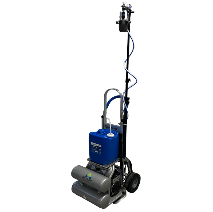 The micro-spray system is available as a portable stand-up device for disinfecting the facility (e.g., storage rooms, offices, bathrooms, waiting rooms) as well as farm equipment (e.g., trucks, tractors, etc.). Simply move the stand-up unit to your desired location, plug it in, and complete the disinfecting process. The unit is shipped fully assembled and ready for immediate use.